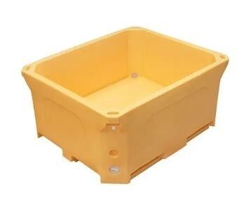 Estes contentores apresentam uma tampa de carregamento superior para fácil acesso e uma alça de borracha para manuseio seguro. O design inclui rodas inferiores em estilo palete, permitindo mobilidade suave mesmo quando totalmente carregados. A cor amarela brilhante aumenta a visibilidade, o que é especialmente útil em ambientes movimentados de armazéns ou entrega.